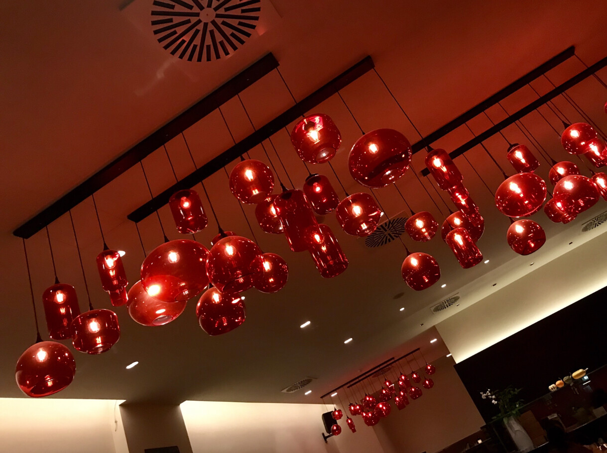 Hängende rote Glaskugellampen über einem modernen beleuchteten Innenraum.