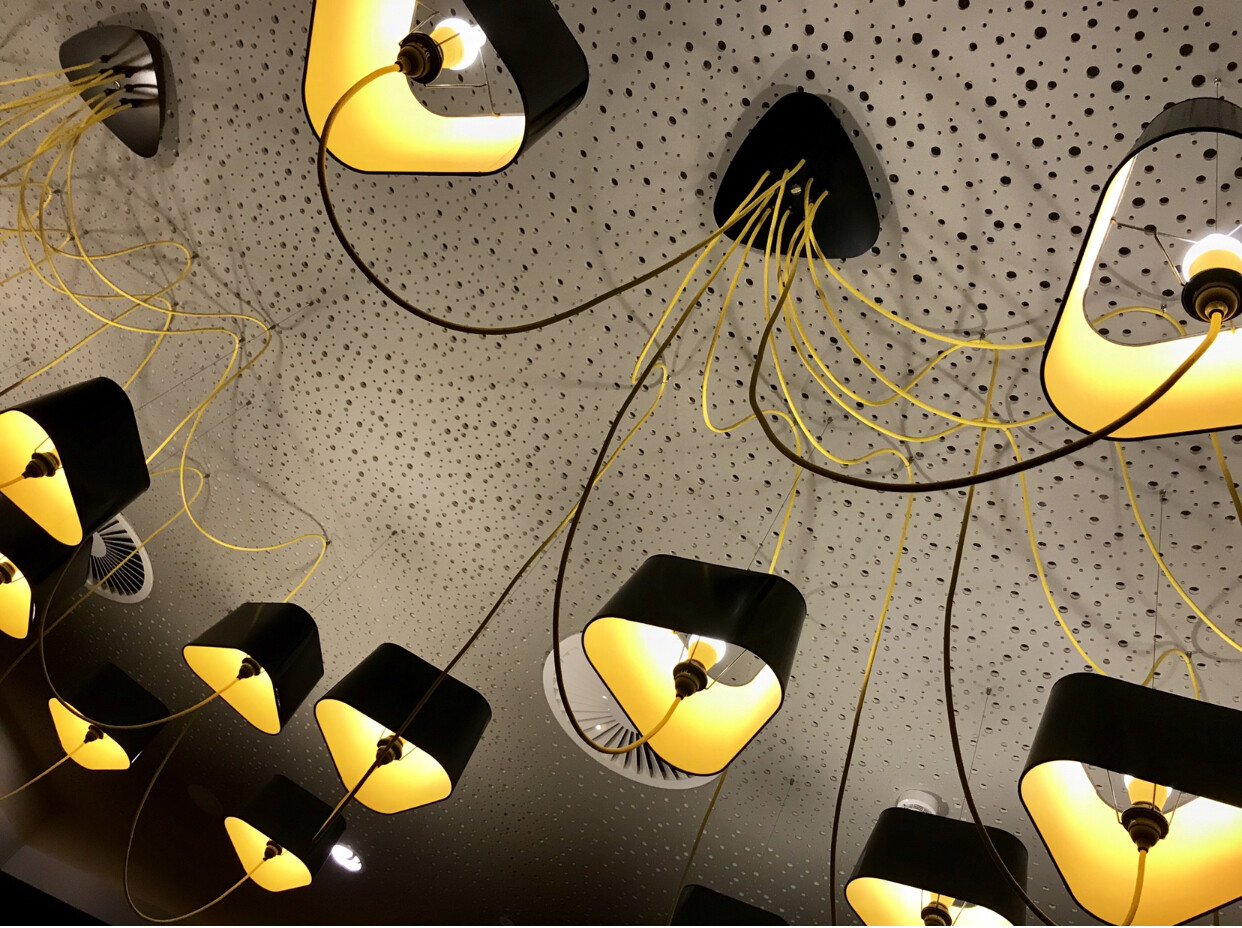 Mehrere gelb beleuchtete schwarze Pendellampen hängen an der perforierten Decke.