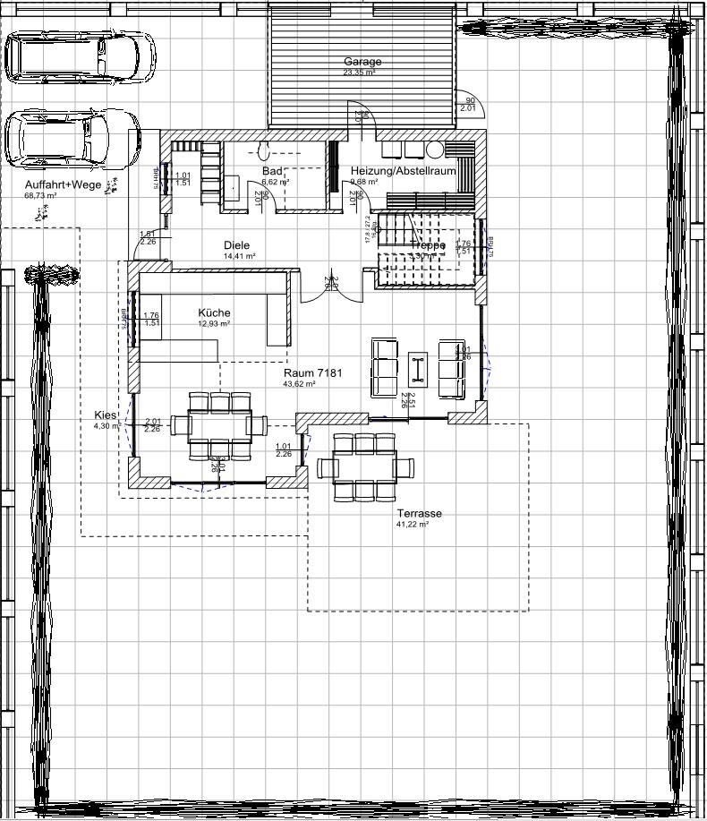 Im Erdgeschoss werden wir den Heizungsraum (ca. 10m2) auch als Abstellfläche nehmen. Ich vermute mal, dass für Heizung, Technik, Lüftungsanlage von den 10m2 Heizungsraum vielleicht nur noch 5m2 zum Abstellen genutzt werden können. Kenne mich da aber auch nicht gut aus. Insofern haben wir uns gedacht, dass wir die Garage (ca. 23m2) neben den Gartengeräten, Fahrrädern, etc.auch noch als Abstellfläche mitnutzten, wobei vielleicht noch geschätzte 10m2 Kellerersatzfläche in der Garage vorhanden ist, wenn man Fahrräder, etc. abzieht. In der Summe wären wir an Kellerersätzflächen bei 5m2 (Heizungsraum) + 10m2 (Garage) + ca. 10m2 im Gäste/Büro, insgesamt also 25m2 Kellerersatzfläche.