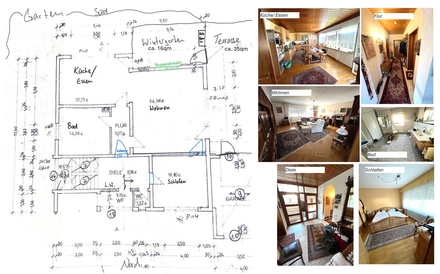 Gerne möchte ich hier den Grundriss des Erdgeschosses – welches ich übernehmen werde – mit euch diskutieren. Das Erdgeschoss ist von den Raumgrößen sehr großzügig geplant, und mir fehlt leider ein gesondertes Zimmer als Büro und Gästezimmer sowie ggf. später als Kinderzimmer. Das Wohnzimmer ist relativ dunkel, da hier die überdachte Terrasse und ein Wohnhaus angrenzen. Die Küche und das Esszimmer sind sehr hell und bieten Blick in den Garten. Das Bad war früher die Küche und wurde vor etwa 10 Jahren renoviert.