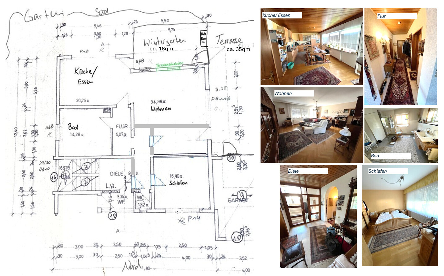 - Holz-Wandschrank im Wohnzimmer entfernen und Fenster/Tür zum Wintergarten für mehr Licht im Wohnzimmer einbauen (Idee im Plan grün)