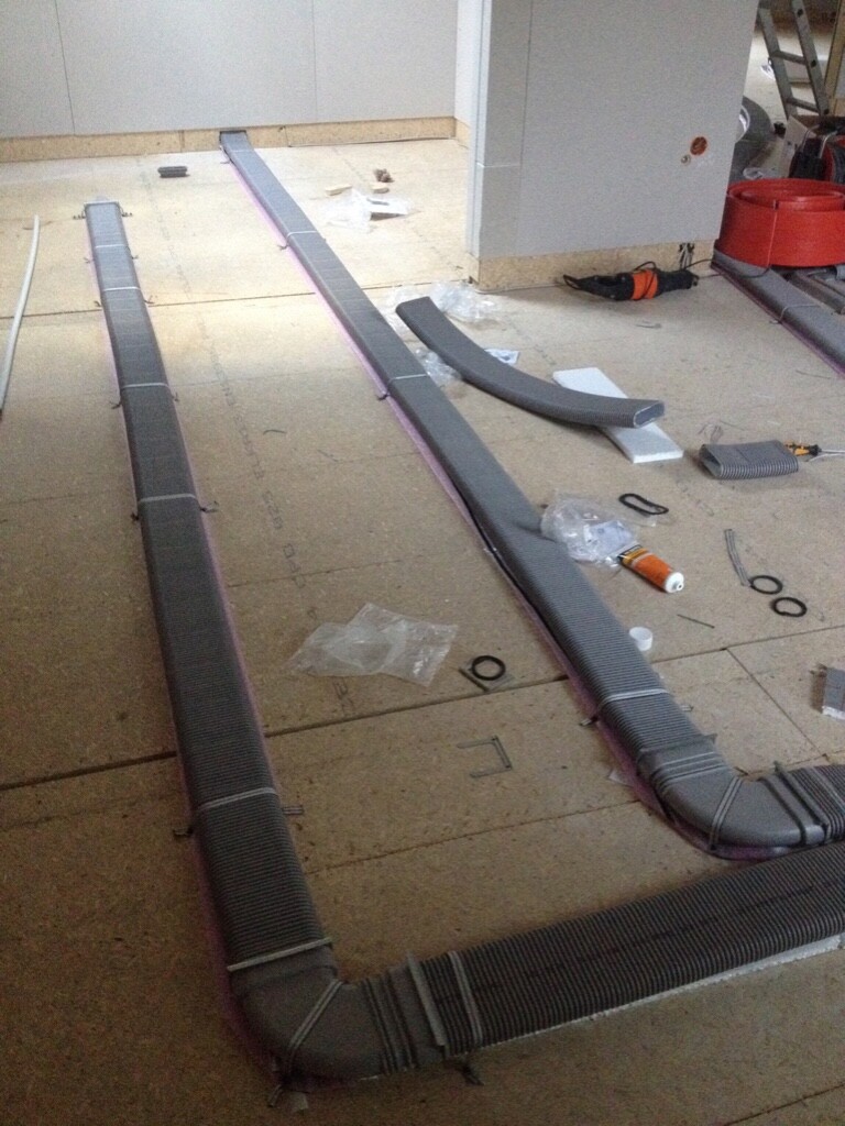 Bei uns im Neubau wurden auch flachkanäle für die Lüftung unter den Estrich gelegt. Das war so geplant. (Also wird es eine gängige Methode sein)