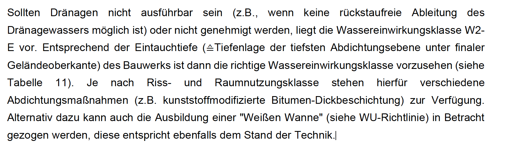 Der Keller ist als wasserundurchlässige Konstruktion („Weiße Wanne“) gemäß den anerkannten Regeln der Technik, insbesondere der DAfStb-Richtlinie „Wasserundurchlässige Bauwerke aus Beton“, auszuführen. Maßgeblich ist die Wassereinwirkungsklasse W2.1-E (drückendes Wasser).