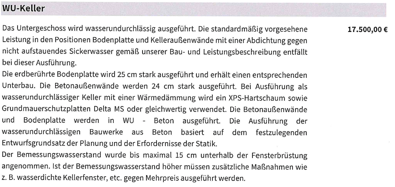 Sämtliche aufgrund der Wassereinwirkungsklasse W2.1-E und des Bemessungswasserstandes erforderlichen Zusatzmaßnahmen (z. B. druckwasserdichte Fenster, Lichtschächte, Auftriebssicherung, Abdichtungssysteme) sind im Festpreis enthalten. Nachträge aufgrund dieser Anforderungen sind ausgeschlossen.