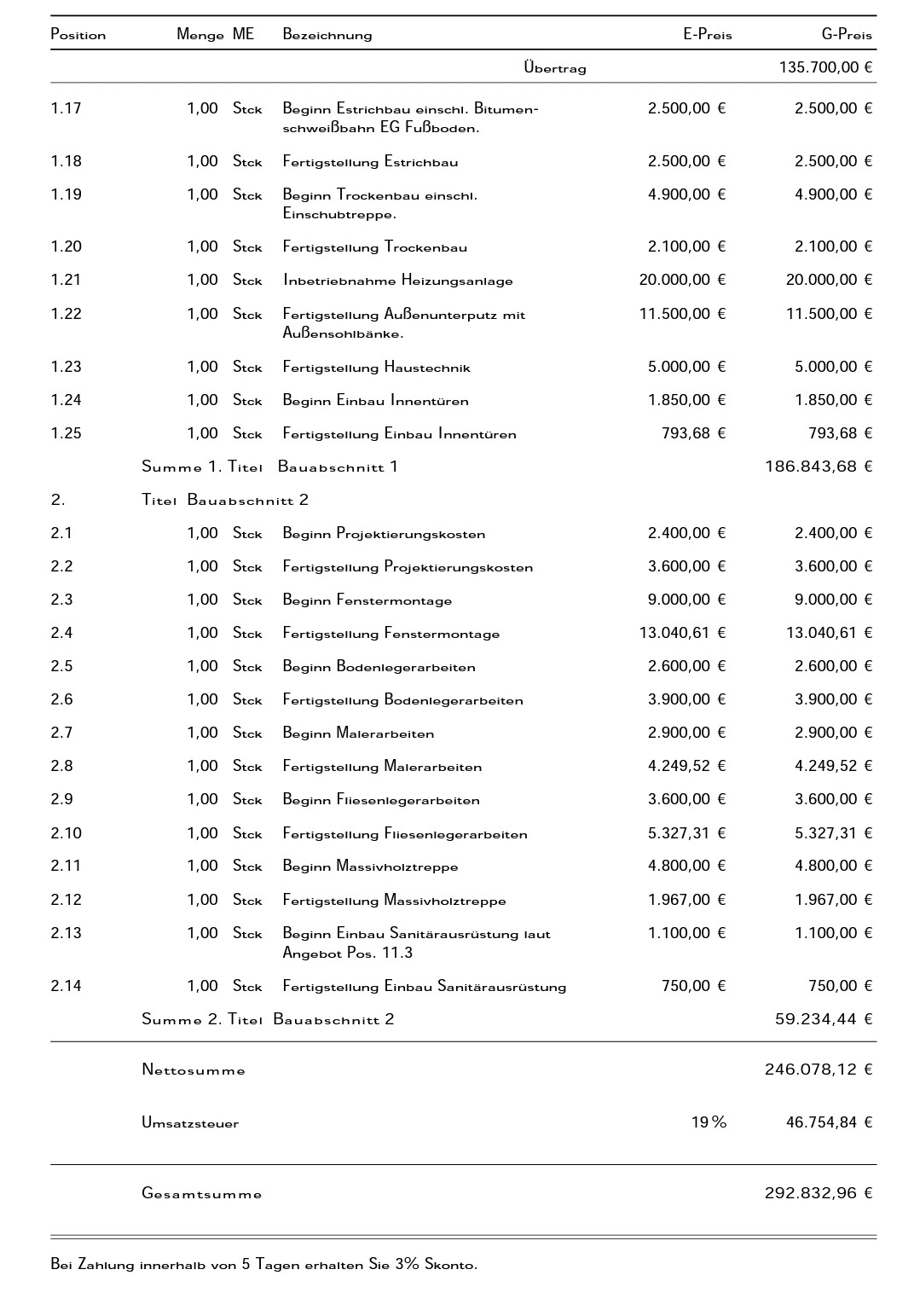 Tja, ist jetzt nicht wirklich viel besser. Ich will niemandem etwas unterstellen, aber wenn die Aufteilung auf zwei Zahlungen (Beginn/Fertigstellung) jeweils in etwa im Verhältnis 70:30 gemacht wird, dann würde mich mal ganz dringend interessieren, was der GU sich dabei denkt. Er selbst zahlt die Gewerke ja vermutlich auch erst nach Fertigstellung (bzw. Abnahme) mit entsprechendem Zahlungsziel.
