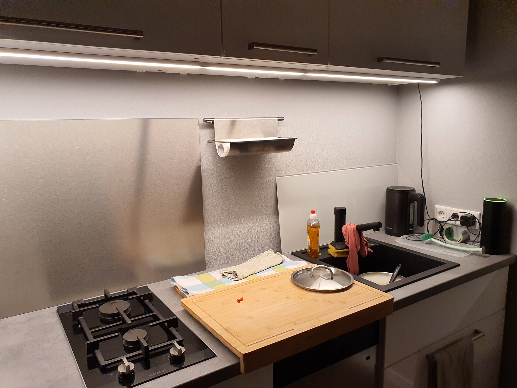 Die LEDs leuchten gleichmässig, sind dimmbar und ausreichend hell. Die hintere Unterkante der Oberschränke sieht aber unschön aus, denke deswegen nach die gegen die bereits erwähnten Panels zu tauschen. (Wein macht mich redselig, anscheinend aber auch schreibselig :eek 🙂