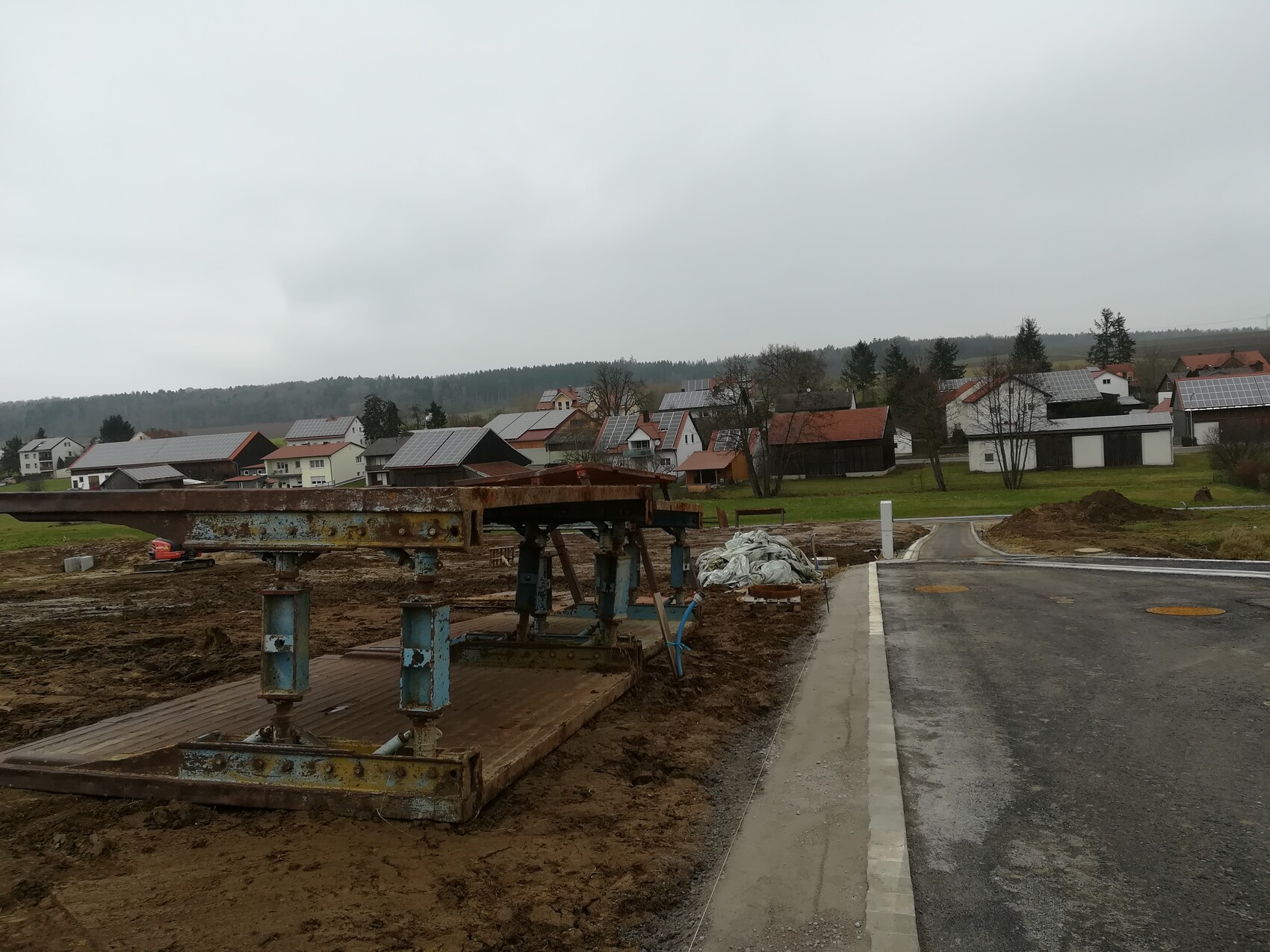 Baustelle am Straßenrand: Holz- und Metallrahmen, schlammiger Boden, Felder im Hintergrund.