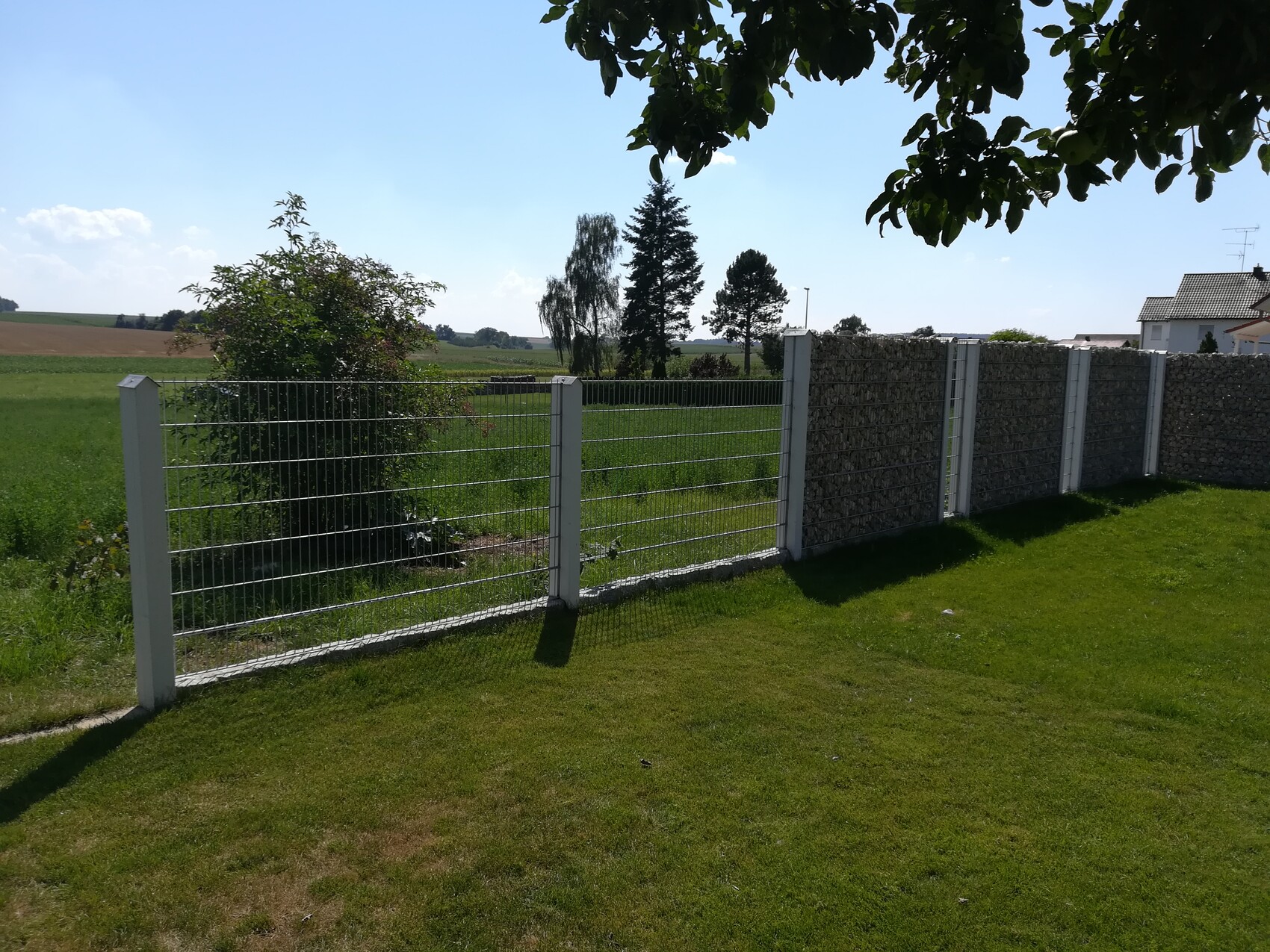 Garten mit weißem Metallgitterzaun links und Gabionenwand rechts, grüne Wiese, Felder im Hintergrund.