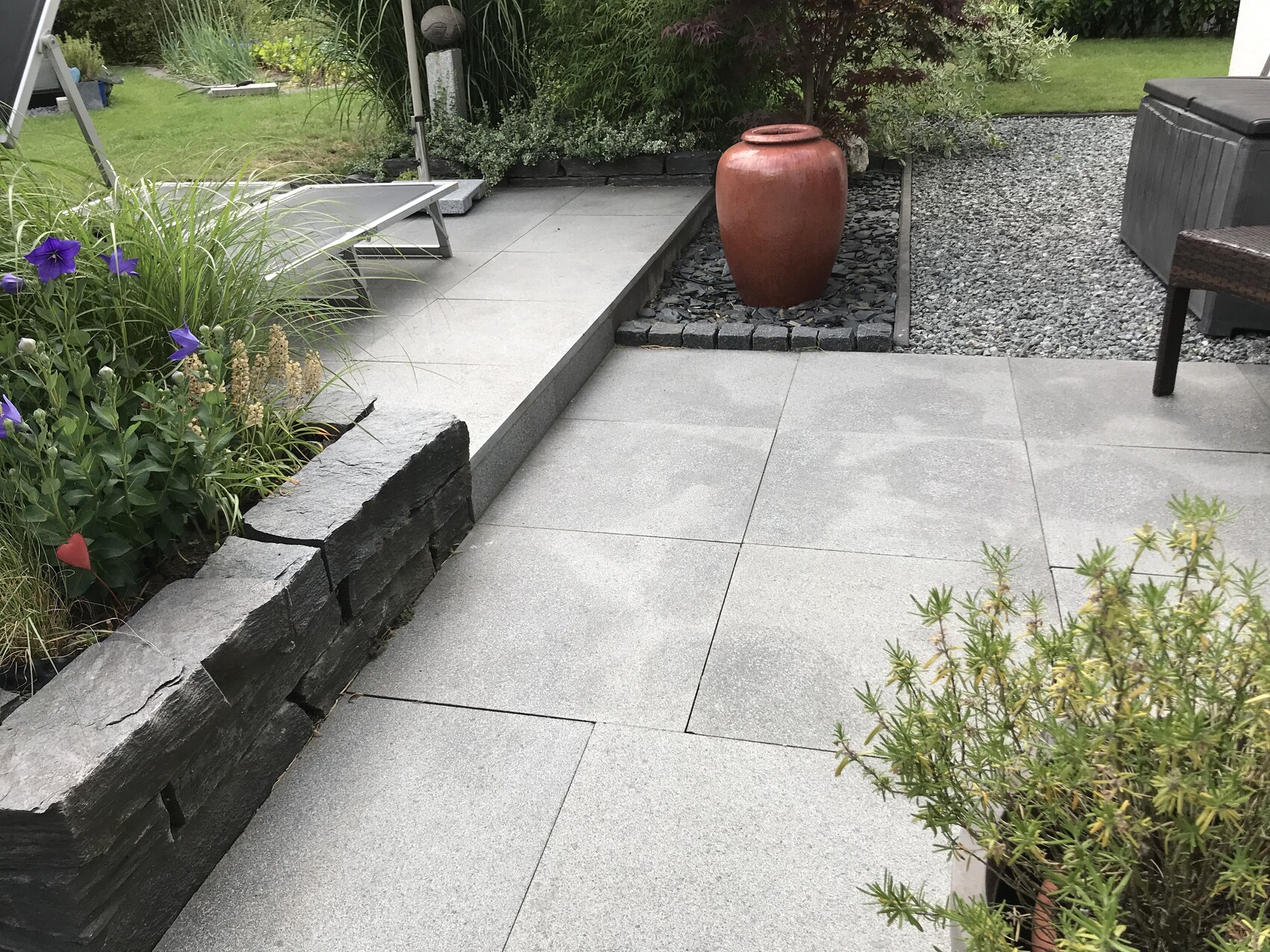 Ein Stück Terrasse mit Schieferstein Noir Toya für die „Hoch“Beete bzw Einfassung, Granit 60 x 60 Athina in Anthrazit, ein paar dunkle Granitsteine 10 x 10, Schiefergedöns vom Baumarkt, und der Schotter zieht sich ums ganze Haus zur Auffahrt, die ebenso aus dem Material ist.