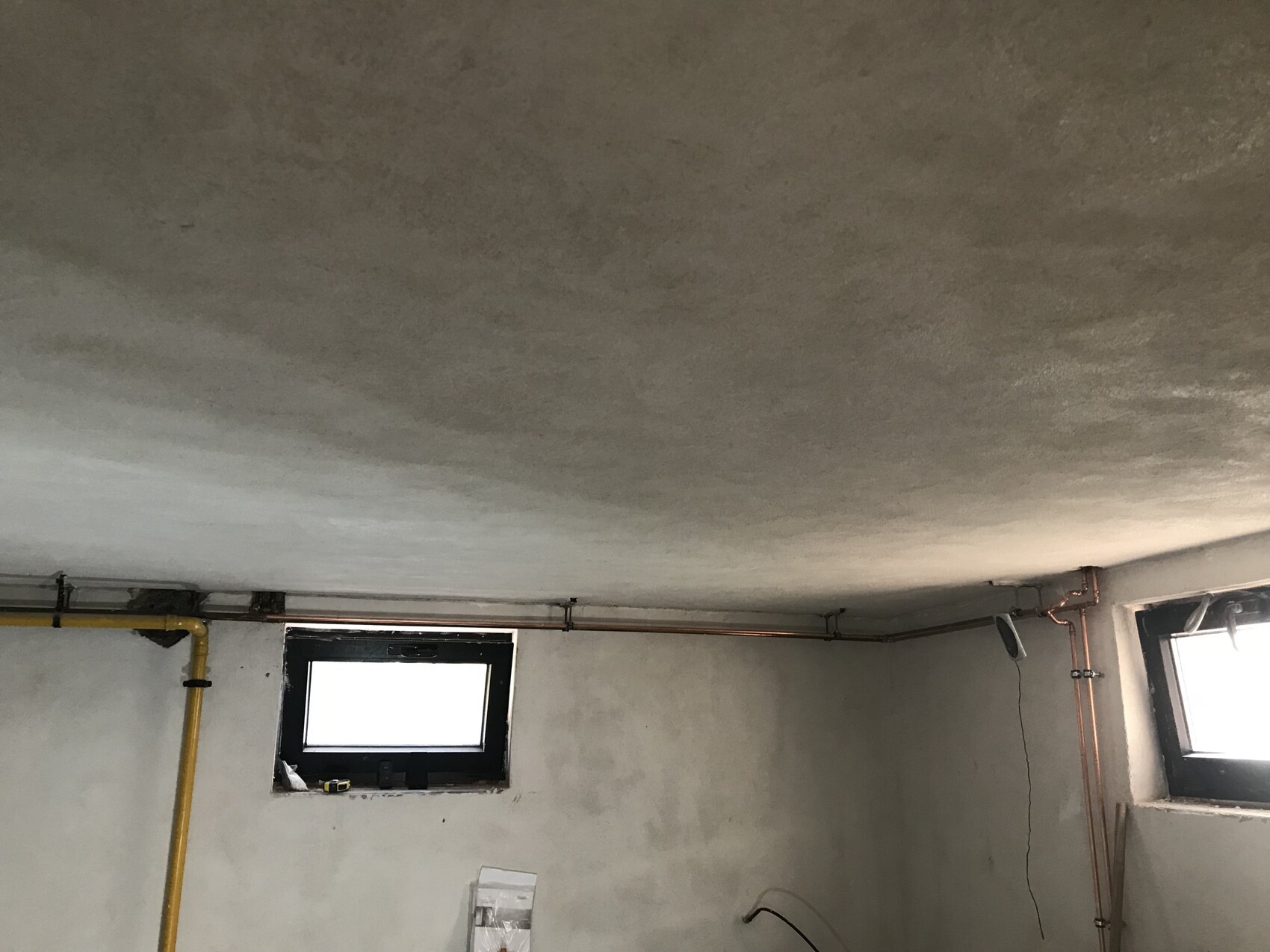 Kellerraum mit sichtbaren Rohren an der Decke und kleinem Fenster, Rohbauzustand