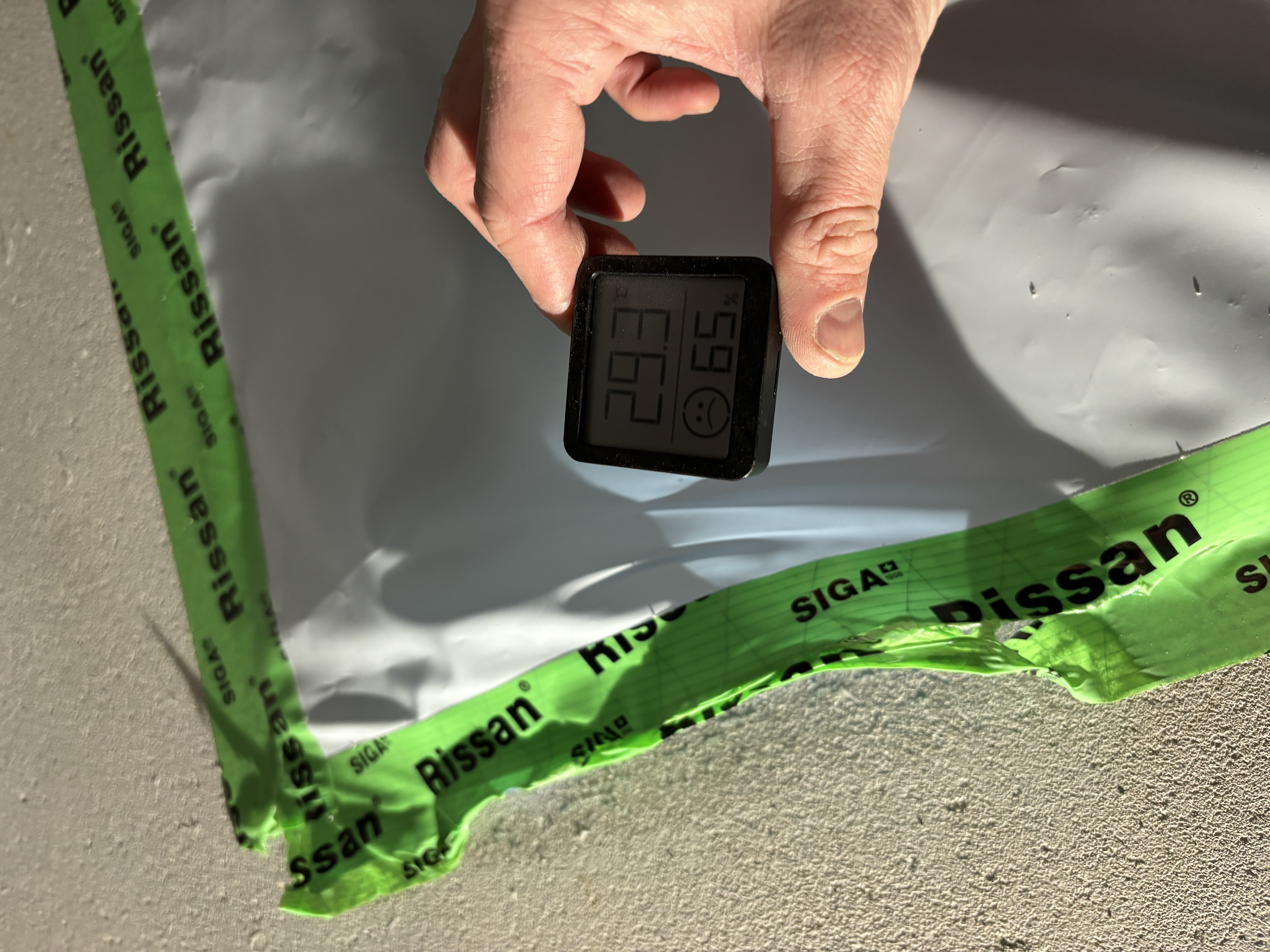 Nach 24 Stunden geöffnet: immer noch trocken und Luftfeuchtigkeit unter 65%. Die Stelle ist einen Meter von dem heutigen Messpunkt entfernt der 2,2% CM hatte. Habe die Stelle wieder geschlossen und das Fenster im Raum lasse ich nun gekippt, gleichzeitig fährt die Wärmepumpe wieder hoch. Mal sehen wie es morgen aussieht.