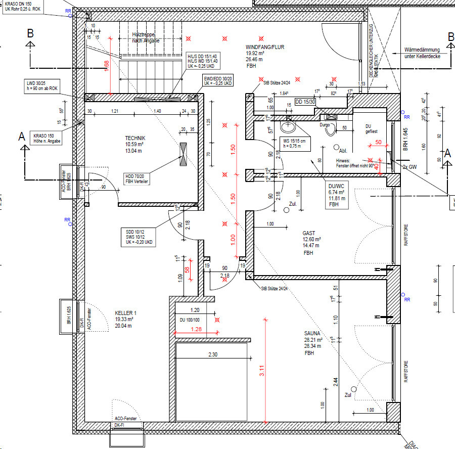 Alle Räume, sowie die Diele, sind beheizt bis auf Keller 1 und Technik. Die Kellerseite ist im Hang, daher weiße Wanne mit 120 mm WLG 038 Dämmung. Front ist gemauert mit U8 42,5er wie auch der Rest des Hauses.