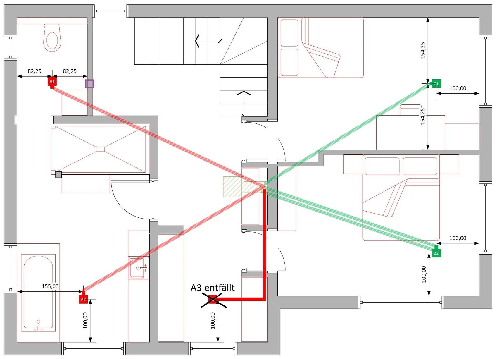 Da es sich um eine Sanierung im Bestand handelt, ist leider die Positionierung der Ventile sehr eingeschränkt möglich.