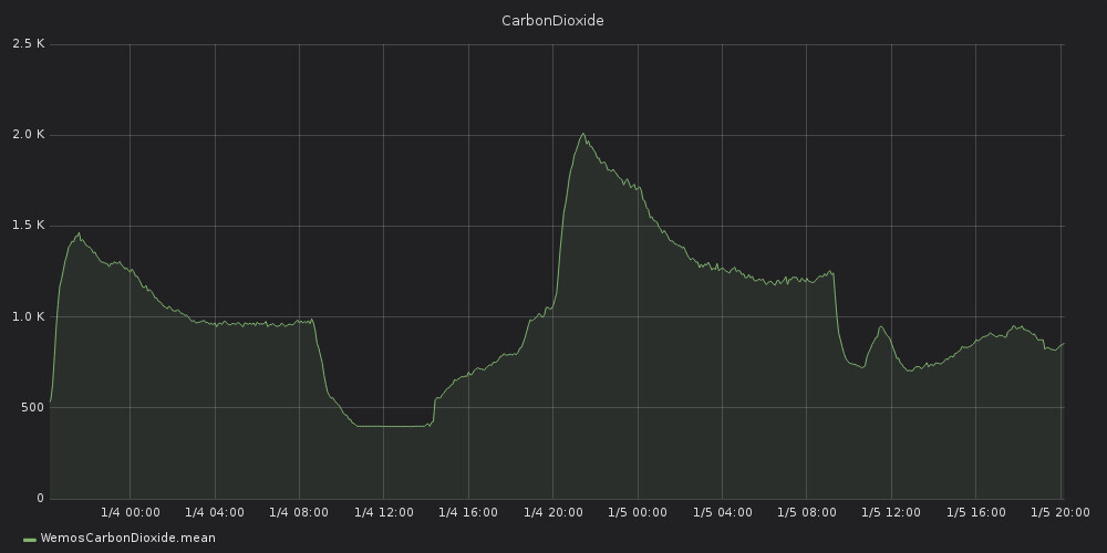 Ich hab mal den CO2-Gehalt des Kinderschlafzimmers der letzten beiden Tage angehängt. 400ppm ist ja Umgebungsluft, in der Regel erreicht das Zimmer das einmal am Tag. Interesant ist die Zu-Bett-Geh-Zeit der Kinder mit geschlossener Tür und 3 Personen im Raum, und die erhöhte Drehzahl ab 0 Uhr.