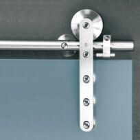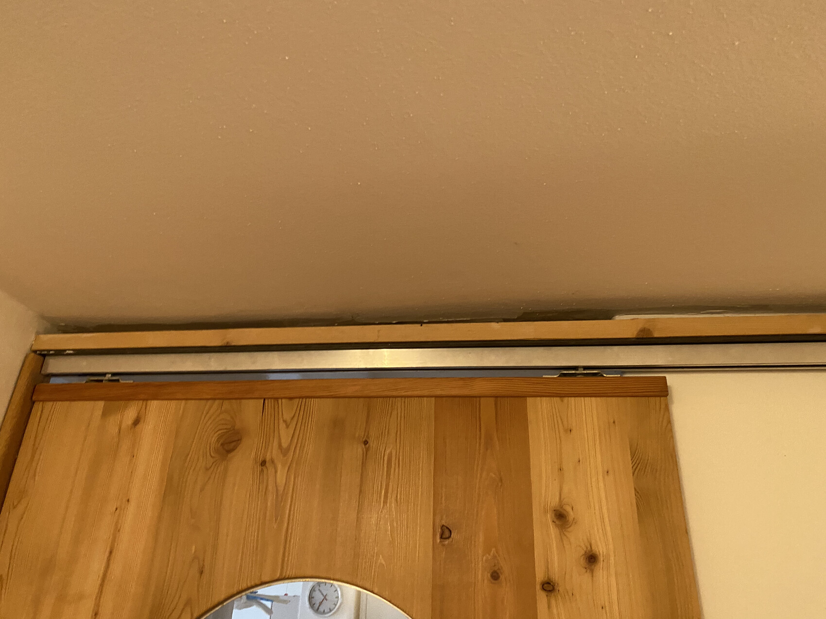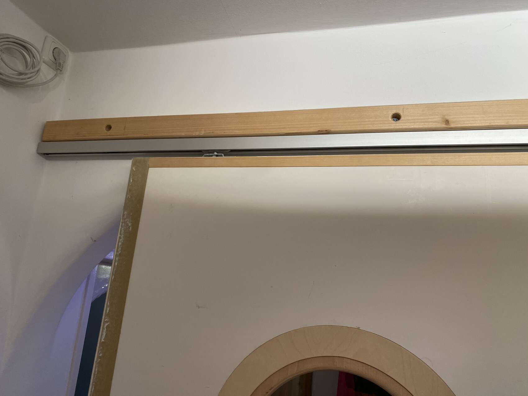 Die Holz-Tür (eine 3-Schicht-Kieferplatte) hängt an einem Doppel-T-Träger.