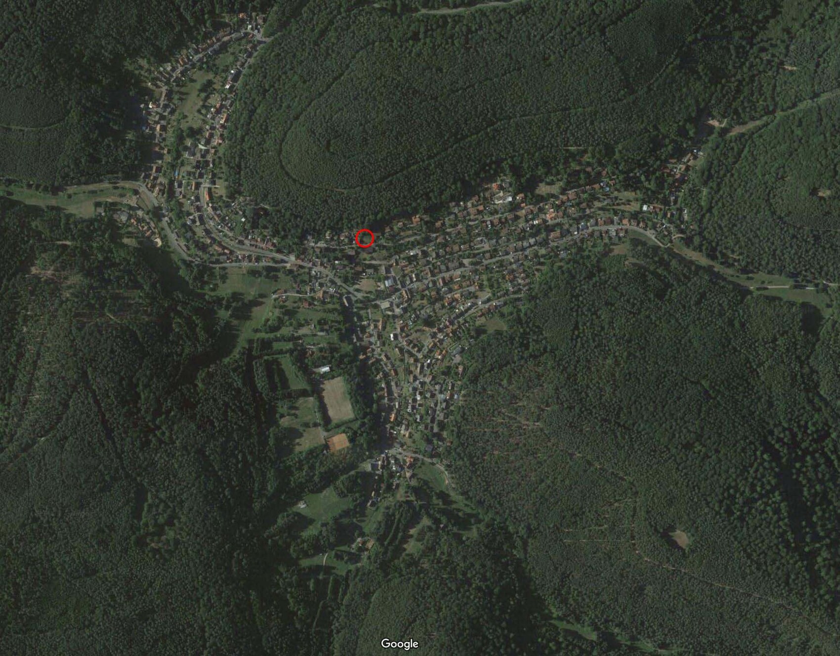 Google Maps siehe unten... Sehr im Wald gelegener Ortsteil, gehört allerdings zu der Stadt, 16 min Fahrzeit nach NW.