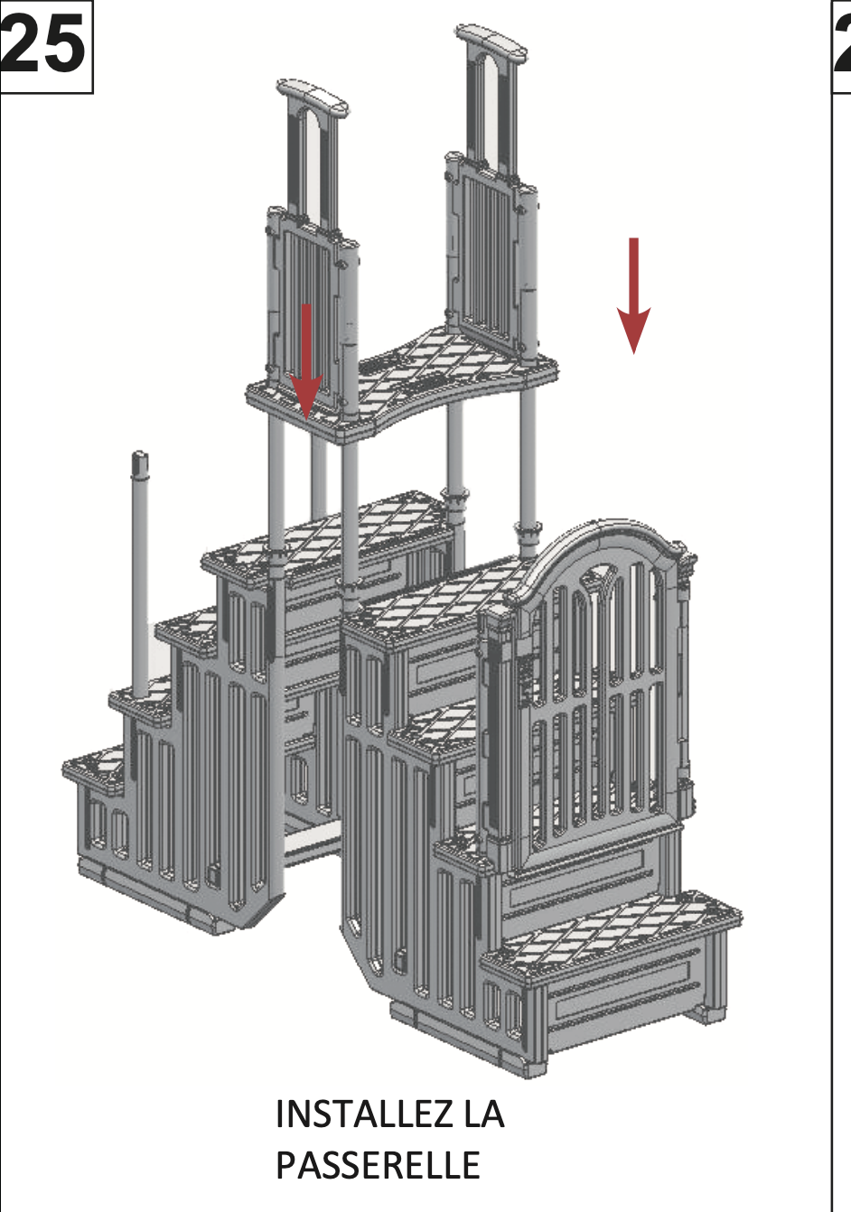 Beim Verbindungsstück handelt es sich um eine Kunststoff-Trittstufe mit zwei seitlichen "Geländer"-Teil. Diese Stufe hat vier Rundlöcher die auf vier lange Pfosten geschoben werden sollen. (entsprechende Bilder aus der Aufbauanleitung anbei).