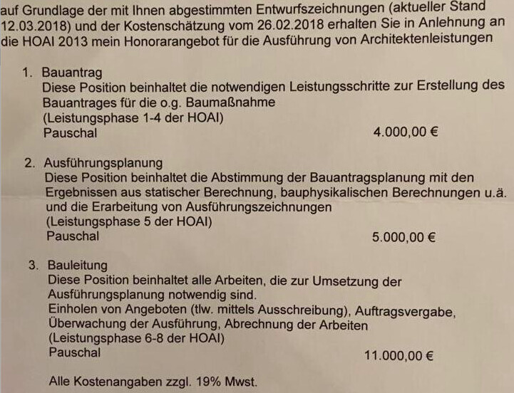 Ja, alle Leistungsphasen. Der Architekt meinte, dass wir einfach selbst schreiben sollen, dass wir 20k Euro + MwSt. pauschal für alle Leistungsphasen vereinbart haben und dieses unterschreiben. Davor hatte er uns aber ein Angebot geschickt, dass ich gleich raussuche.