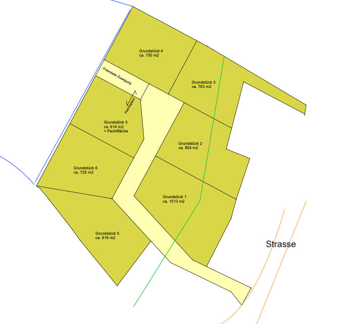 In der Skizze habe ich die existierende öffentliche Strasse eingezeichnet und auch die hinterliegende Fläche blau markiert zumindest ihren Anfang.
