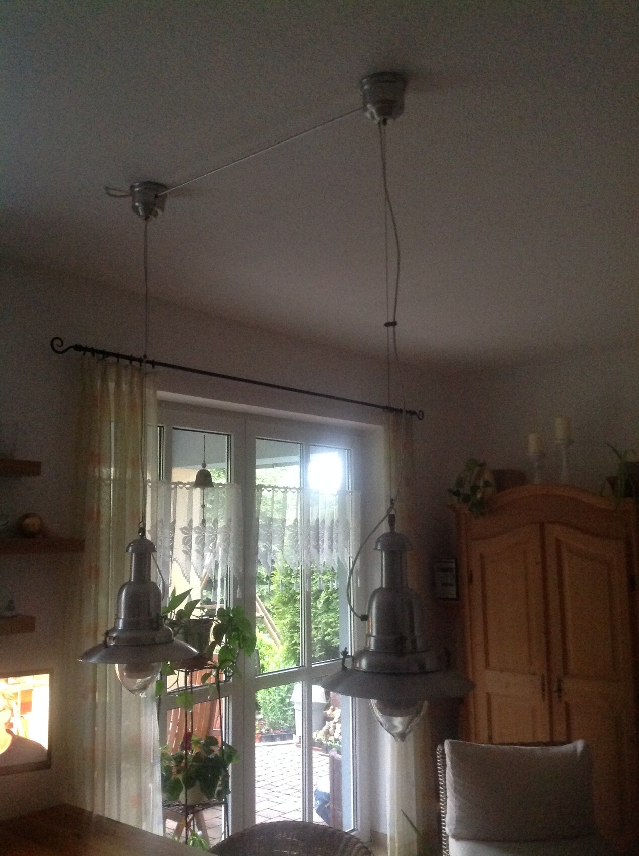 Die Lampen sind schon alt, vor 15 Jahren mal aus dem Baumarkt mitgenommen. Sie hingen früher getrennt... aber irgendwann war es uns am Esstisch zu dunkel und wir haben beide Lampen hintereinander gehängt. Das Aluminium-Rohr "schwebt" ca. 3 cm unter der Decke und steckt in den Lampensockeln drin (also diese Aluminium-Dinger in denen sich die Kabel "verstecken"). Dafür hatten wir jeweils ein Loch in den Aluminium-Sockel der Lampen gebohrt. LG Steffi.