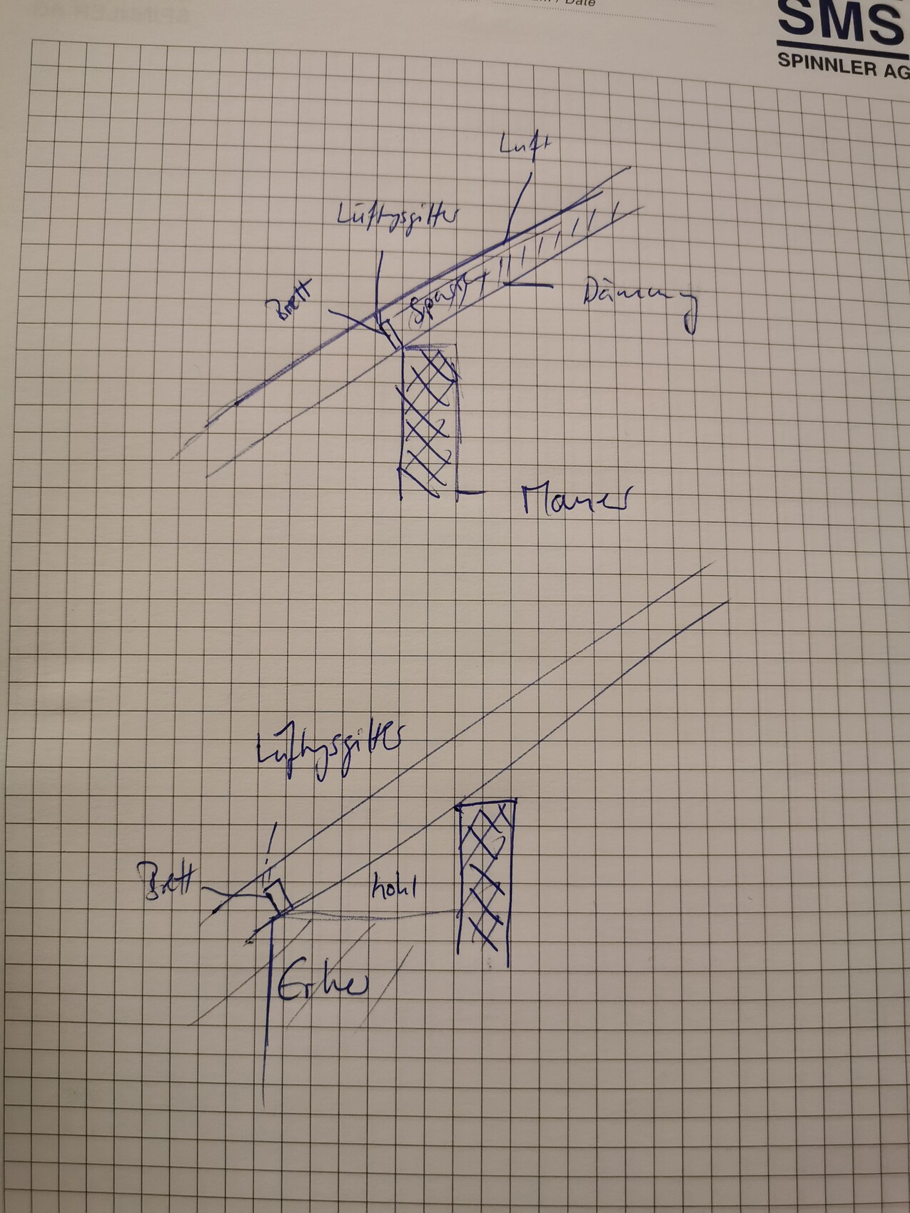 Handgezeichnete Bau-Skizze zeigt Lüftung, Dämmung und Mauerwerk im Grundriss