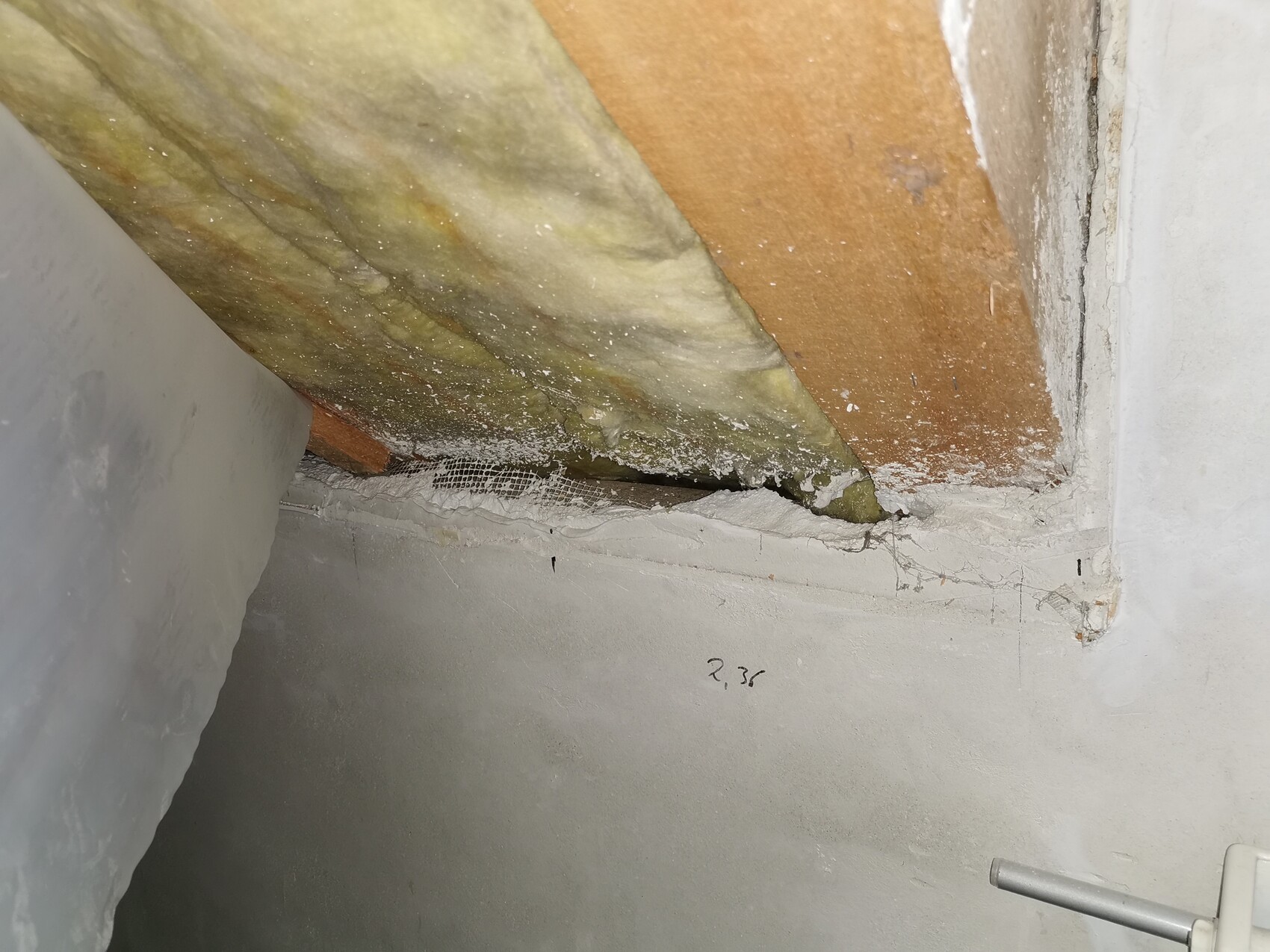 Offene Wand/Deckenstelle mit Dämmung, Netzgewebe und Putzresten.