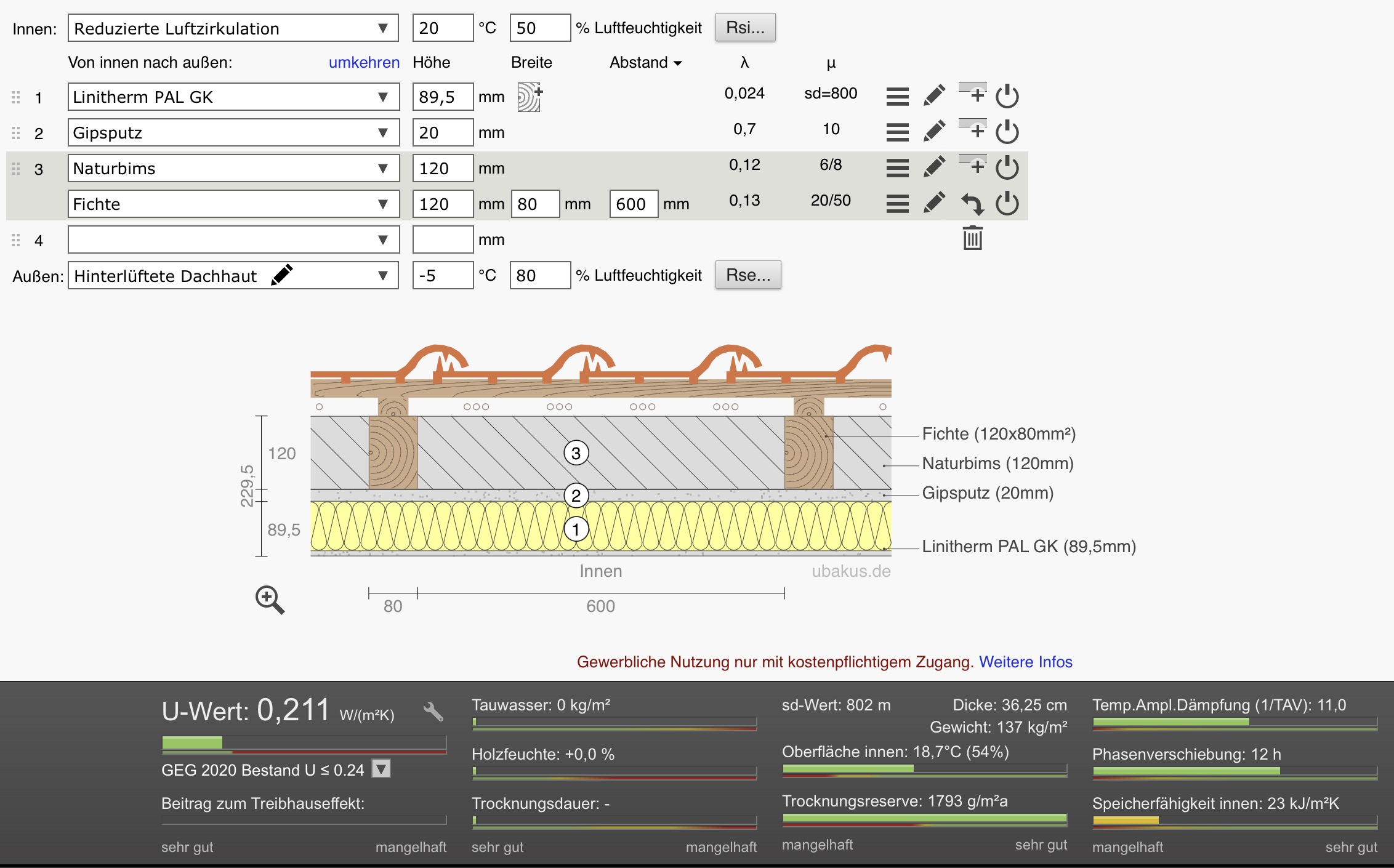 Wir haben vor fünf Jahren ein Einfamilienhaus (BJ 1956) gekauft und seinerzeit die Dachschräge lediglich von innen gedämmt (89,5mm Linitherm Pal GK). Hintergrund: die Dachschräge ist im Wohnbereich mit 12cm hohen Bimsstein ausgemauert, welche wir zunächst aufwendig hätten entfernen müssen. Die aktuelle Konstruktion hat einen U-Wert von 0,211, wobei die Daten zum Bimsstein unklar sind.