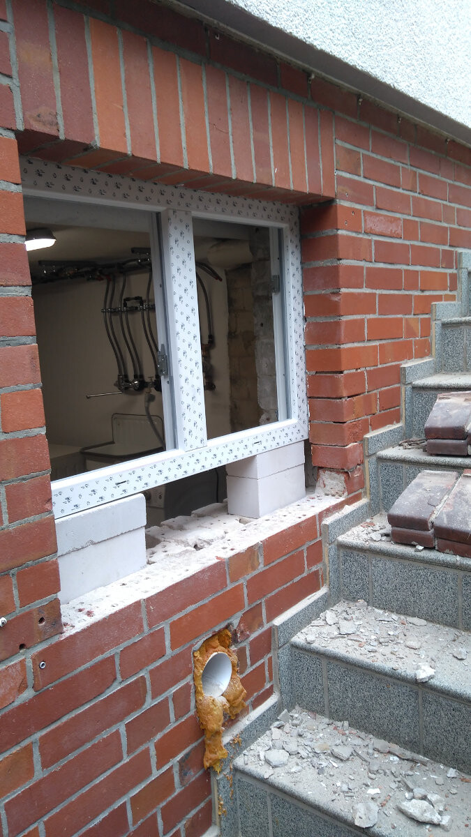 窗户制造商用压缩带将侧面和顶部的端面连接到外墙。底部仅置于建筑泡沫上,内部侧面和顶部也用泡沫填充。因此,我必须自己处理,确保外部与墙体有符合RAL标准的防雨连接。