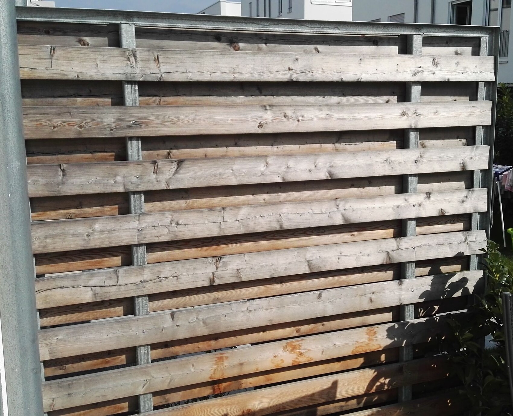 我想用一些耐候且易于维护的材料替换我这个防护屏风中风化的木板(见照片)。目前,两边的木板是错位安装的,所以墙体是开放的。今后希望有一个封闭的表面(为了隔音和隐私)。