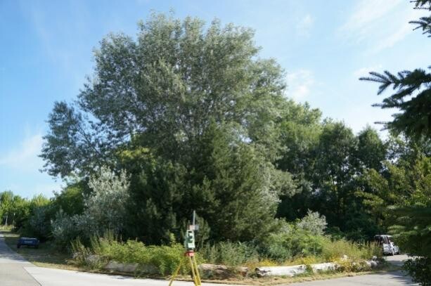 在我们的建筑用地上,建筑范围中央有一棵大白杨。树干周长2.85米,测量高度为2.30米。正如图片所示,这是一棵相当大的树。