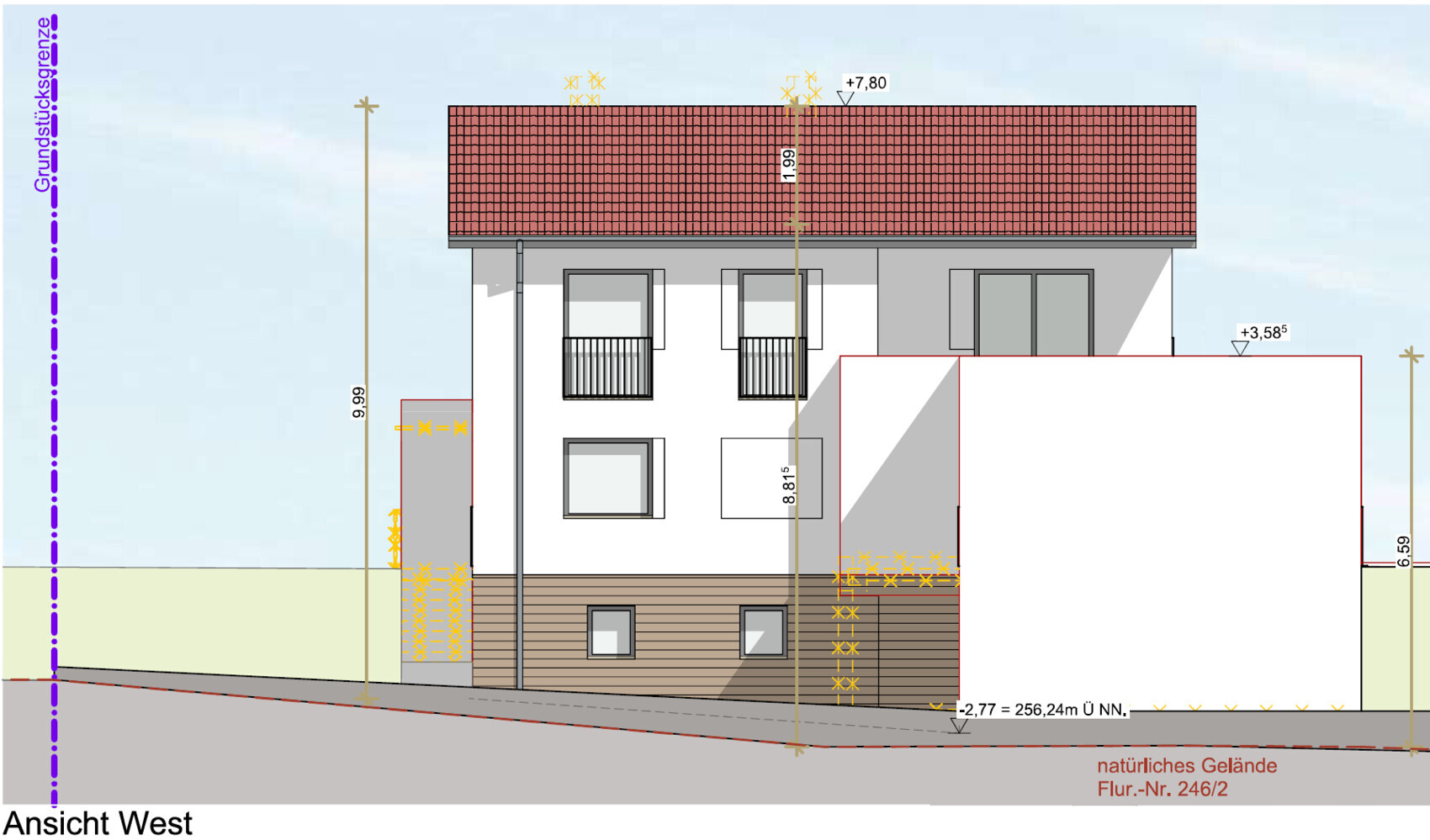 但为了获得更美观的立面效果,负斜坡那一侧可见的地下室部分以及阁楼将采用斜方形木板(可能是未处理的落叶松)进行覆面。